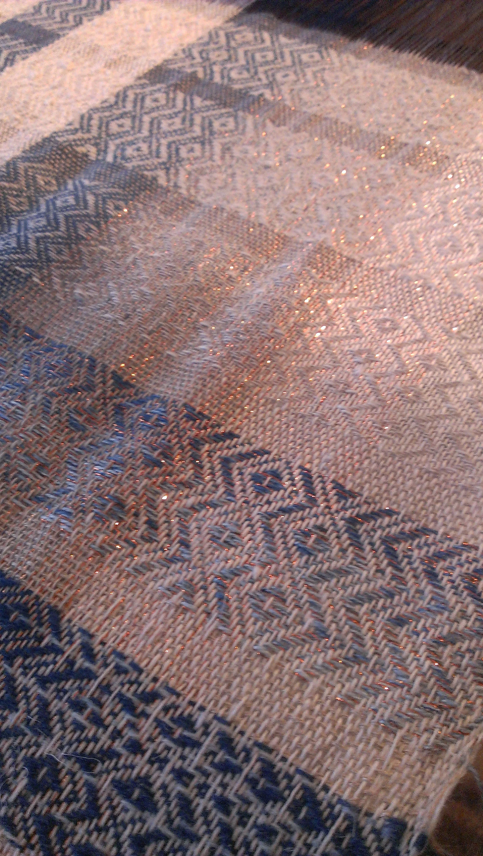 The picture opposite shows detail from a mixed linen warp including copper inspired by evening sun light on the sea.